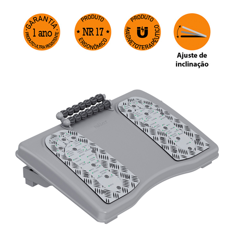 Contribui para o aumento de produtividade no trabalho, evitando que o usuário sinta fadiga muscular devido ao mal posicionamento constante. Apoio para Pés Magnético e Massageador em conformidade com a NR 17 do Ministério do Trabalho (Norma Regulamentadora de Ergonomia).