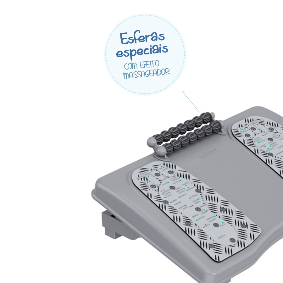 • Esferas Massageadoras – Que tal uma massagem relaxante nos pés? O Apoio para Pés Magnético e Massageador contém esferas massageadoras com rotação 360 graus. Nossos pés são um dos pontos do corpo que mais sofrem devido ao stress e cansaço do dia-a-dia. As esferas auxiliam no relaxamento da planta dos pés através do contato direto, proporcionando uma massagem gostosa e relaxante. Para utilizar esta função, é necessário estar de meias ou descalço (Obs.: a cor das esferas pode variar para tons mais claros ou mais escuros).