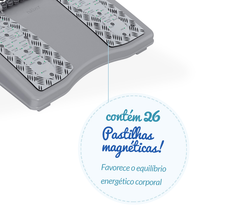 • Contém 26 Pastilhas Magnéticas especialmente posicionadas que combinam as terapias de Magnetoterapia com a terapia oriental da Reflexologia (partes do corpo refletidas na planta dos pés). O magnetismo é permanente e promove o equilíbrio do fluxo energético do corpo (Obs.: para obter os benefícios do campo magnético e dos massageadores, é necessário o uso diário e descalço pelo período mínimo de 15 minutos);